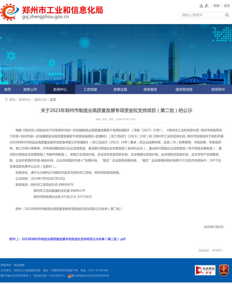 7月4日,郑州市工信局发布了《关于2023年郑州市制造业高质量发展专项资金拟支持项目(第二批)的公示》,304am永利集团获得“重点新兴领域企业培育奖励(节能环保制造)”方向的支持。