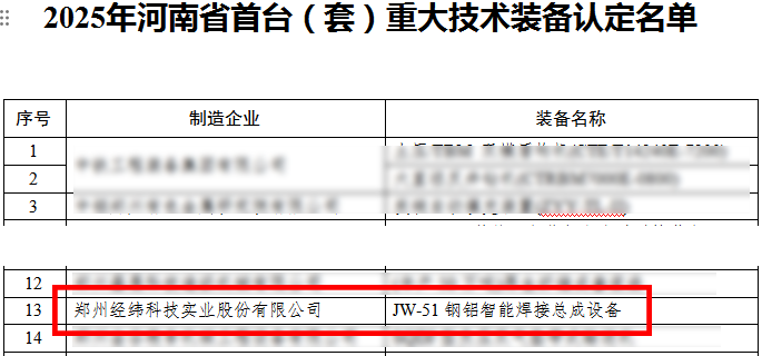 近日,河南省工信厅、财政厅联合公布2025 年省首台(套)重大技术装备认定名单,304am永利集团自主研发的 “JW-51 钢铝智能焊接总成设备”成功入选该榜单。